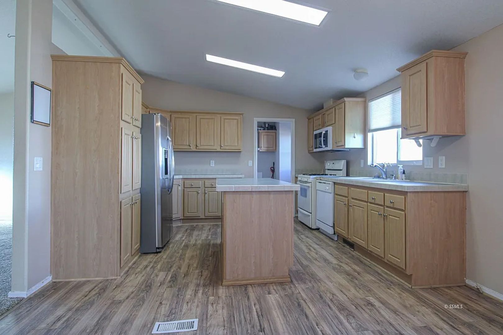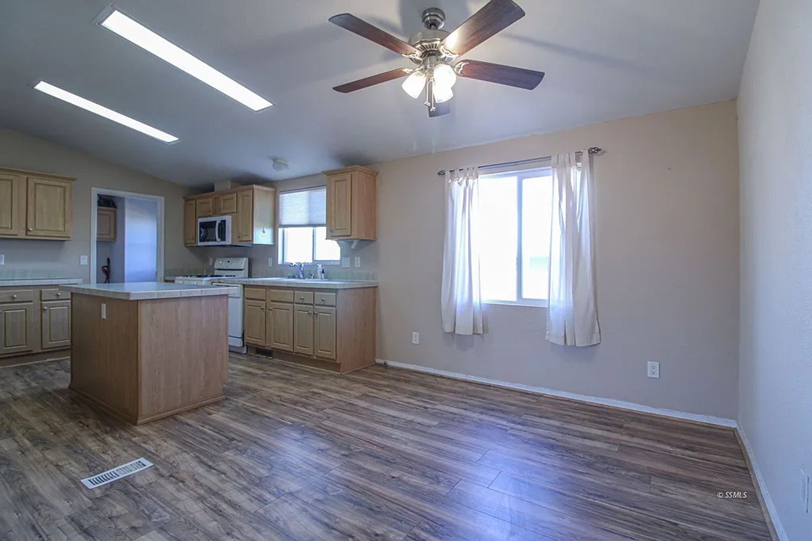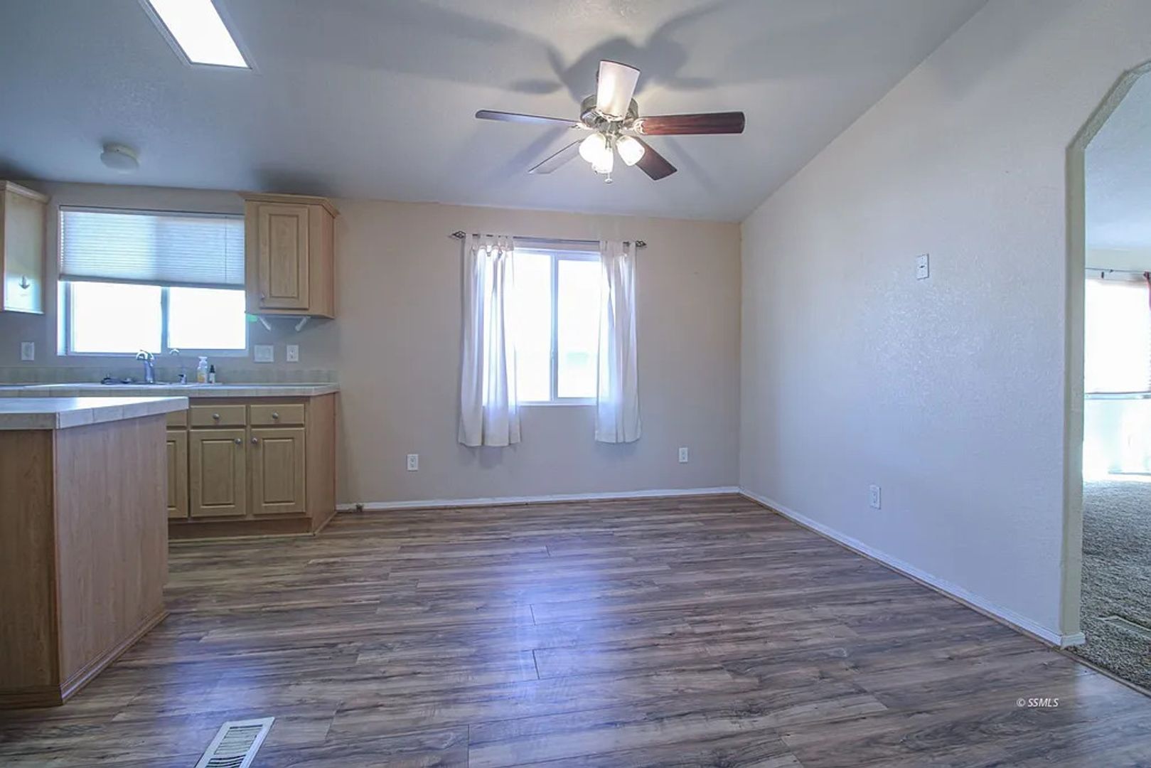 Manufactured Home on a Corner lot! The front living room has sunny windows and a ceiling fan. The kitchen offers solid surface counters, plenty of cabinets for storage, a range with microwave hood and an adjacent dining room with ceiling fan which then enters into the family room. The spacious family room has a warm inviting fireplace and ceiling fan. From the family room, lovely French doors open out to the generously sized back deck, a great space for entertaining! .All three bedrooms have ceiling fans for comfort. Both bathrooms offer vanities with sold surface counters. Also provided is a ramp for easy access to the front door. Home has an inside laundry room.